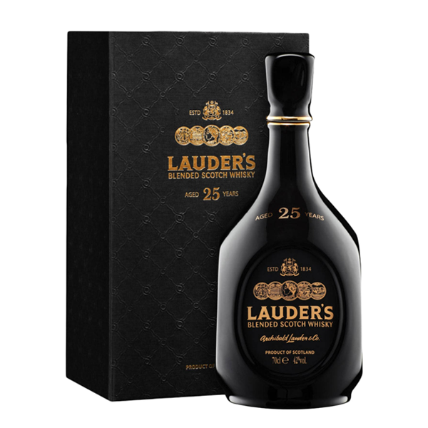 Lauder’s 25 Year Old Whisky is a distinguished blend that represents over 180 years of Lauder’s tradition. This whisky is crafted from selected malt and grain whiskies, aged for a minimum of 25 years in a combination of ex-sherry and ex-bourbon oak casks. The result is a complex and deep flavor profile featuring rich dried fruits and subtle spice.